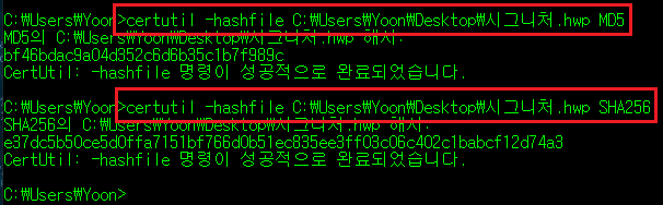 certutil -hashfile 경로(파일을 끌어서 cmd창으로 이동하면 경로 자동지정) 해쉬함수 대문자로 지정(MD5등..)